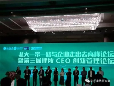 2017年4月26日-28日,由北京大学主办的“北大一带一路与企业走出去高峰论坛暨第三届律所CEO创新管理论坛”在北京大学隆重开幕,会期三天。掌舵者(北京)咨询有限公司董事长向颖先生应邀出席本次论坛会议。